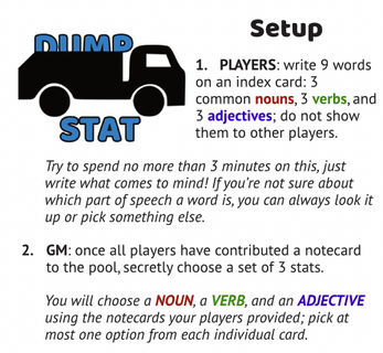 Dump Stat is a short one-shot game about choosing an arbitrary set of words as your TTRPG character stats.