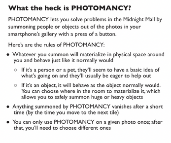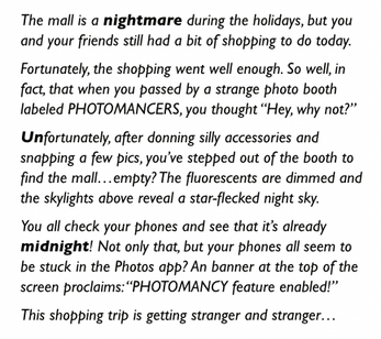 As you explore the Midnight Mall (a surreal labyrinth that resembles a typical modern shopping mall), you'll solve problems by finding photos on your phone, sharing them with your fellow players, and then summoning the contents of those photos to help you progress through the mall.