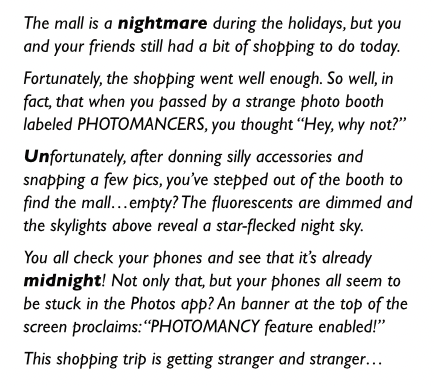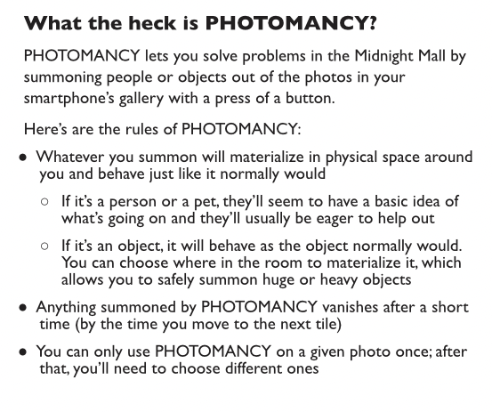 PHOTOMANCERS is a one page (double-sided, still counts) holiday game to share with friends or family as you unwind at the end of the year. You can play it with virtually no materials at all besides the printed game and each player's smartphone.